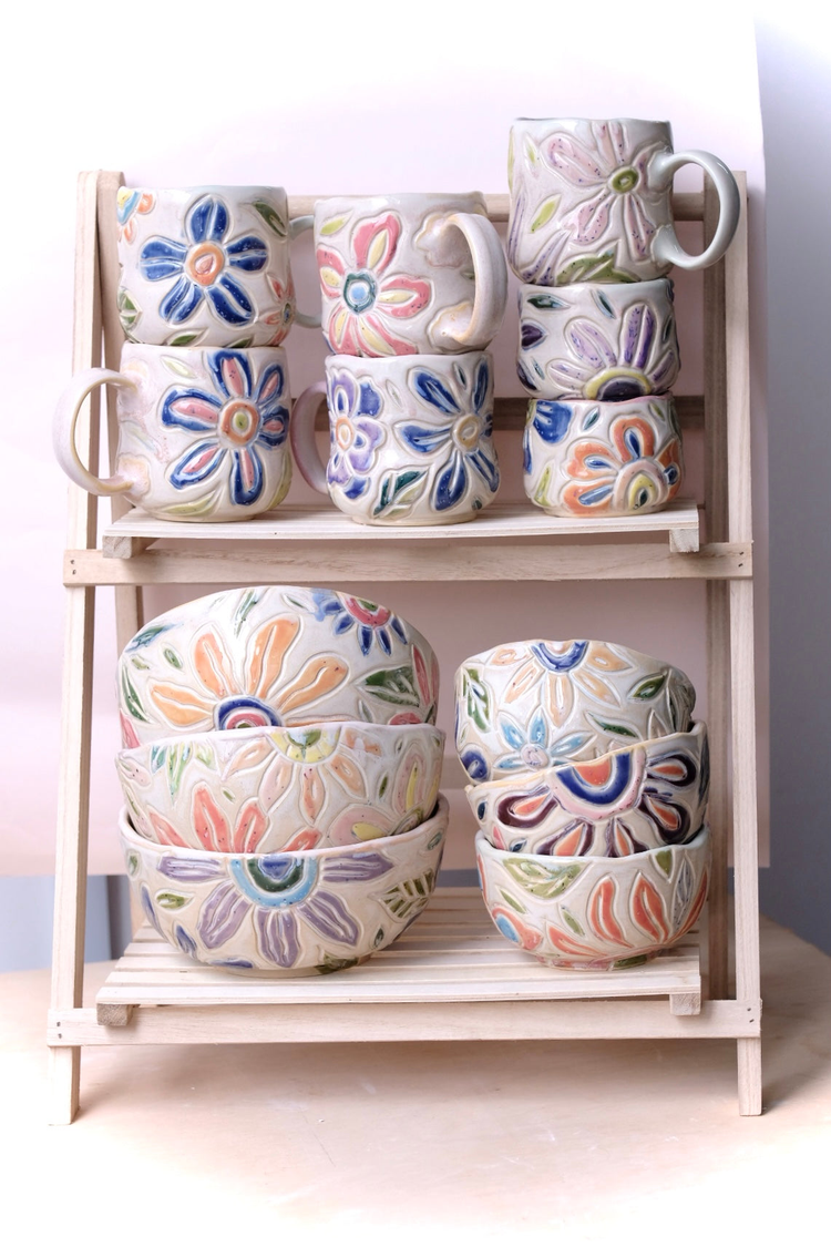 First made as a gift in 2016, the carving of flowers all around a clay body is back again, looking like a bouquet of ceramics.