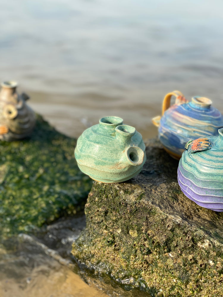 A collect of different variety of 'Seaheart Vessels'. All usually that fits the palm of you hands and looks like they were treasures of the ocean. Some pieces varies more earthy looks and some are the classic greens of the original Seaheart colour.