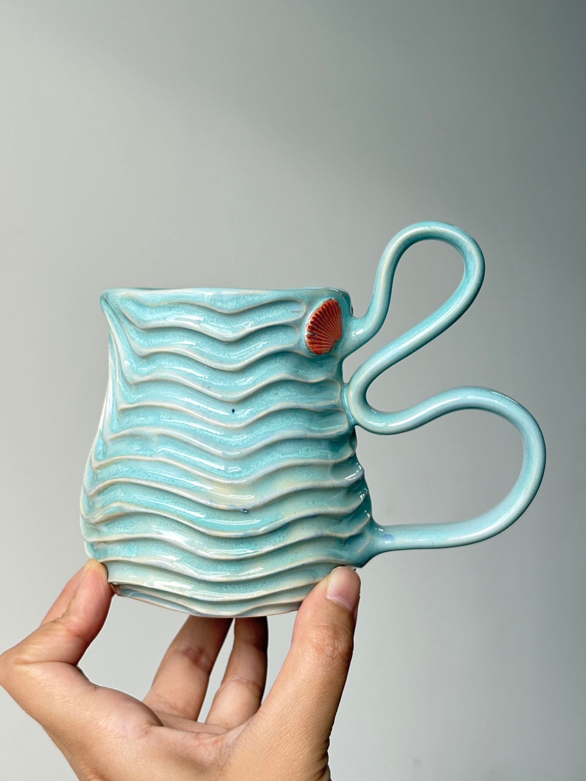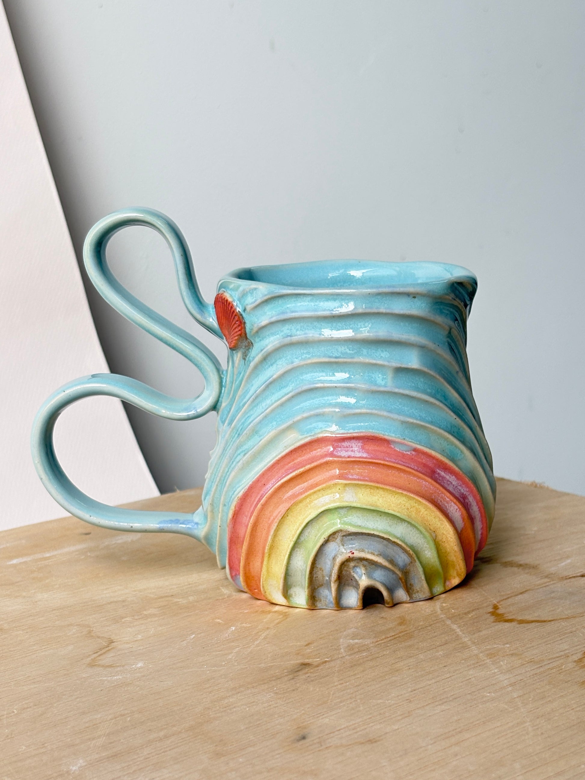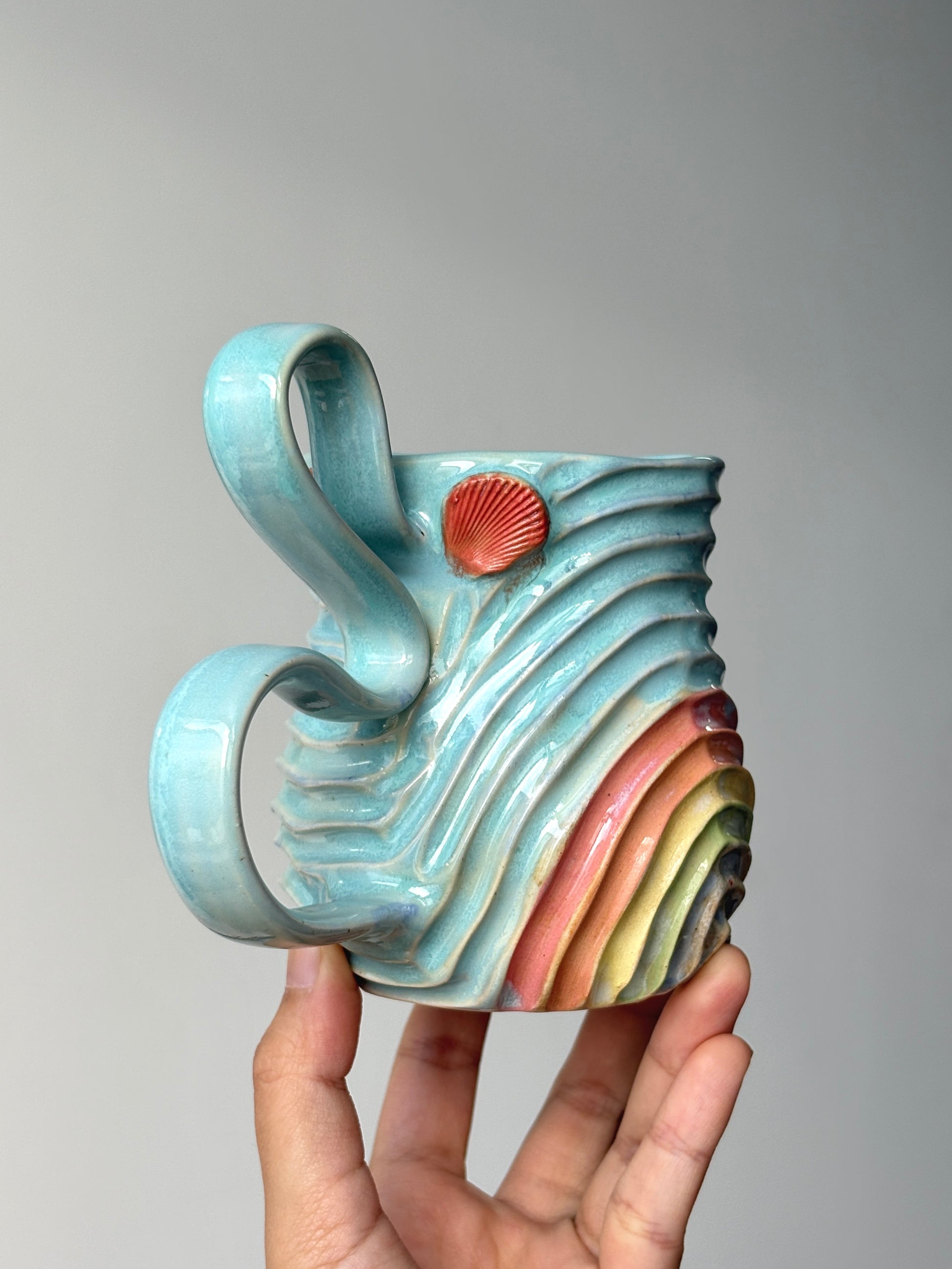 A crystal blue all radiant around the seabed mug, with a rainbow belly and adorned with shells even.