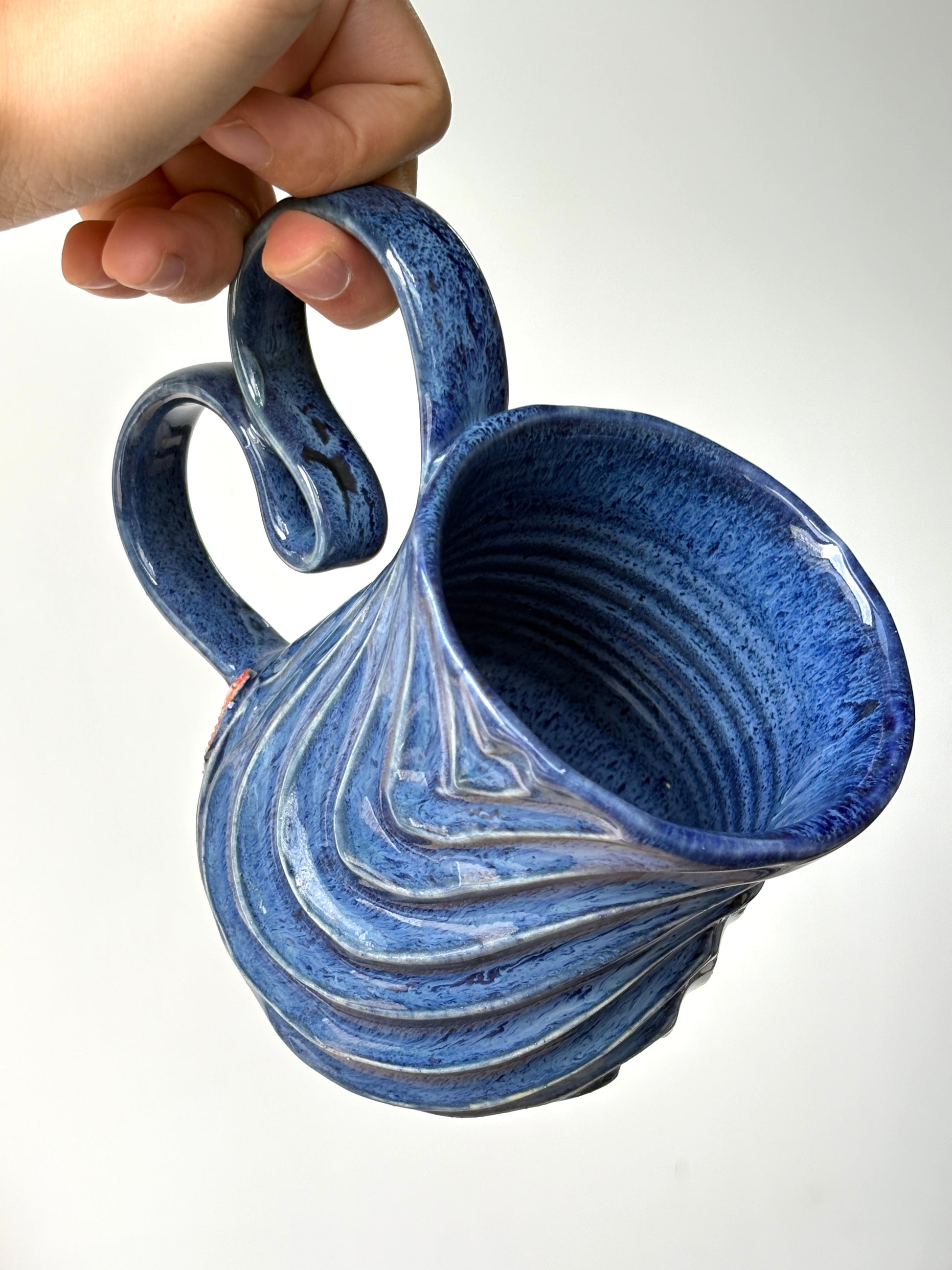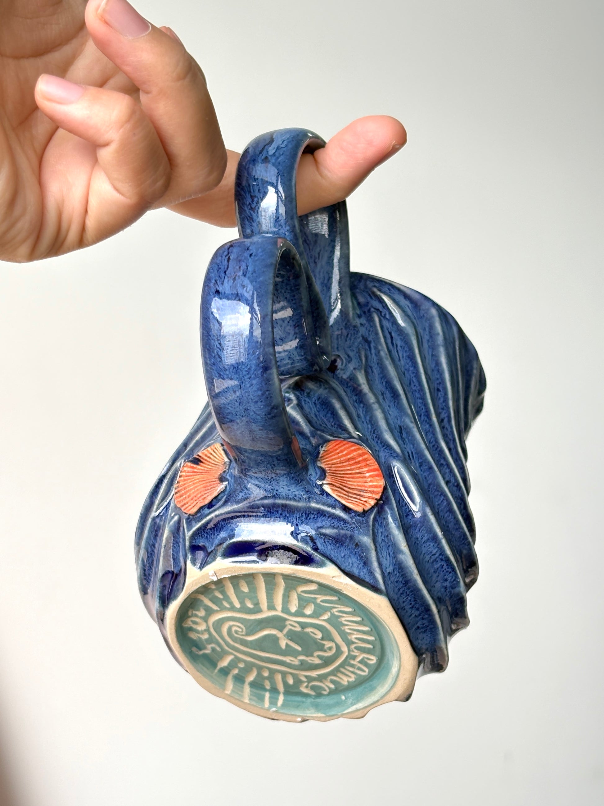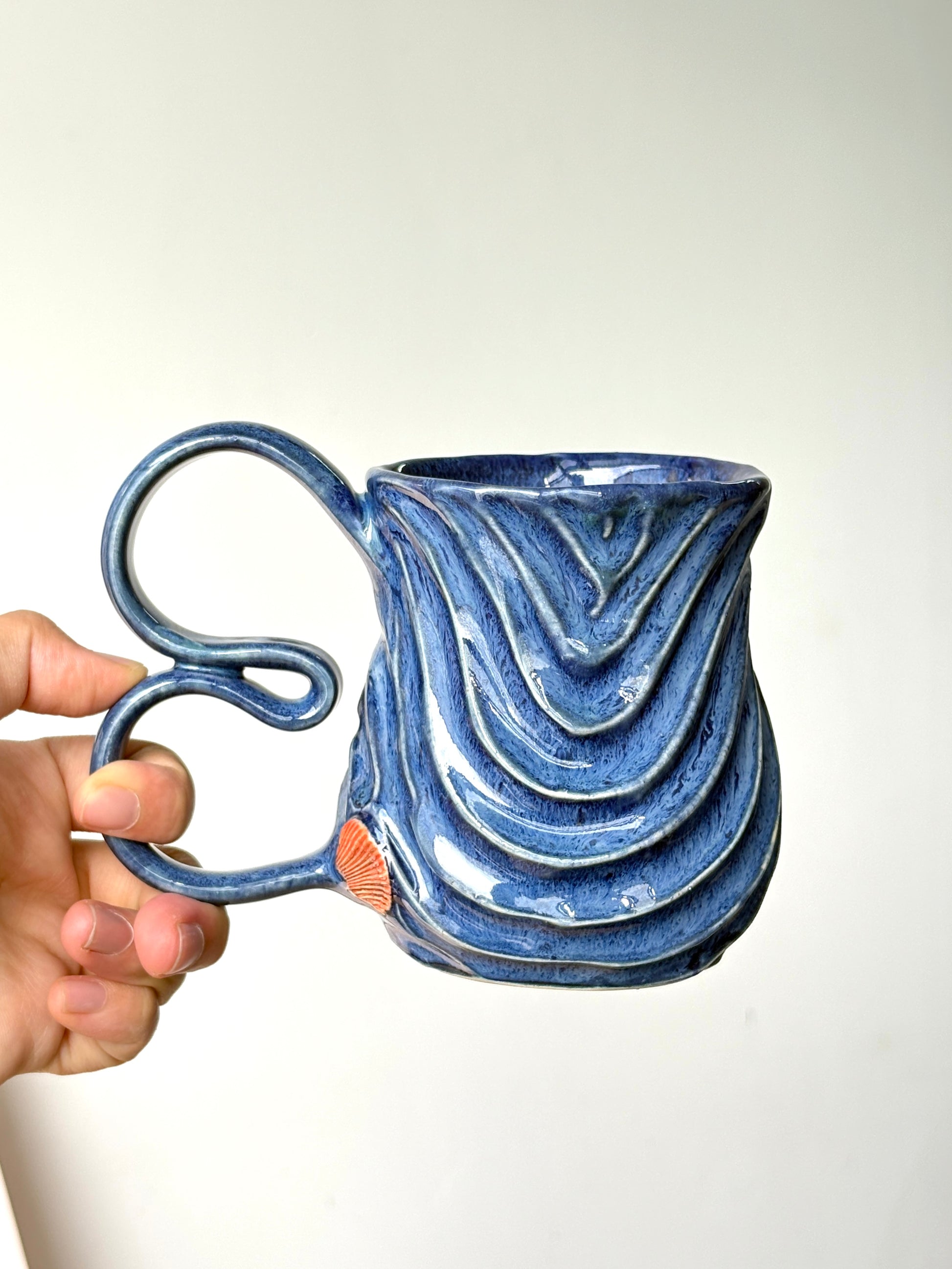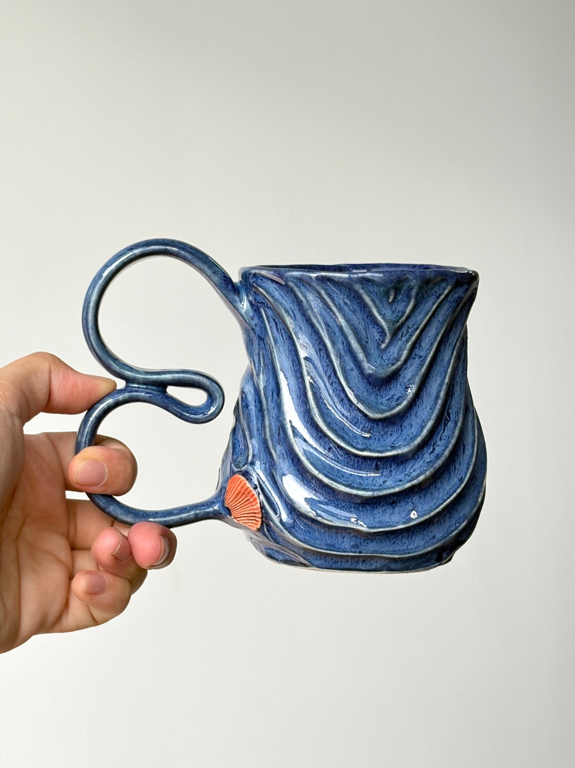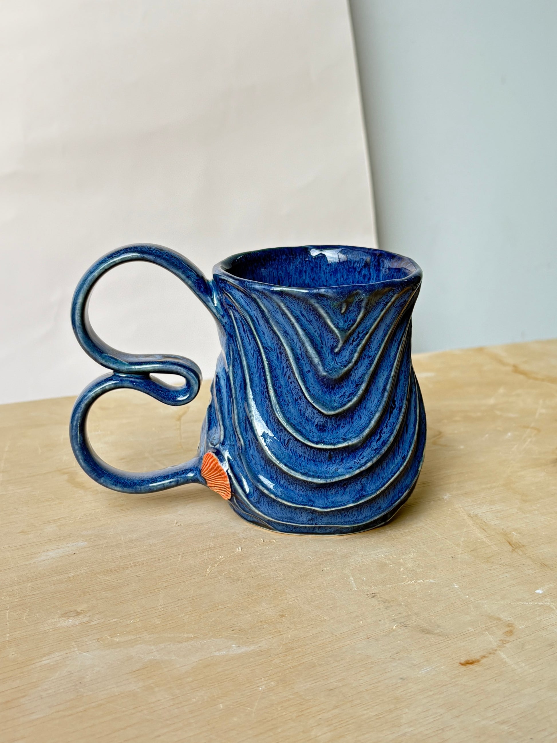 A deep blue Seabed Mug adorned with two orange seashells at the bottom.