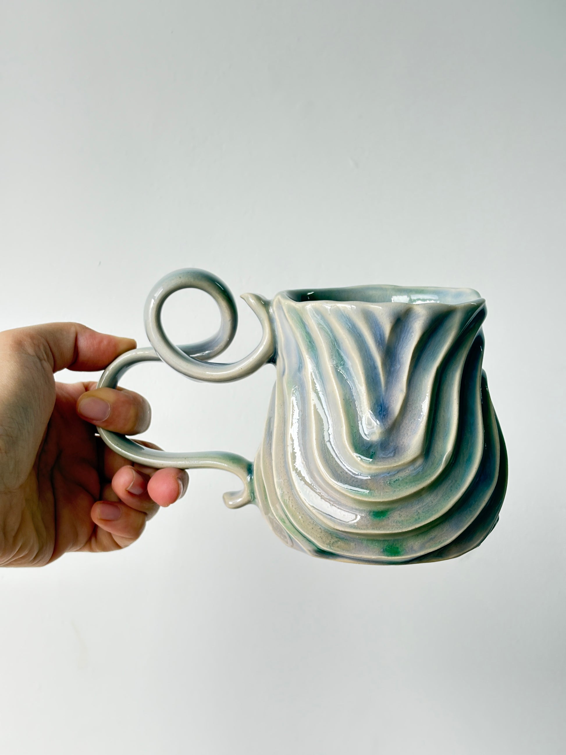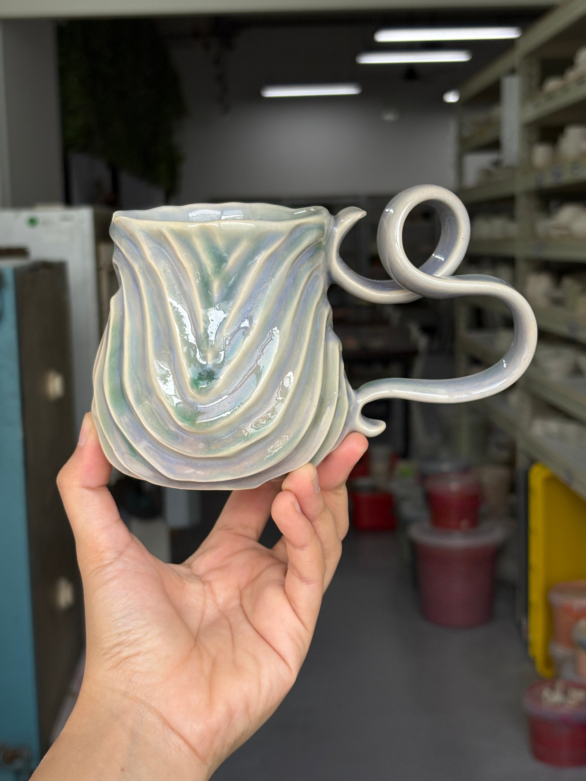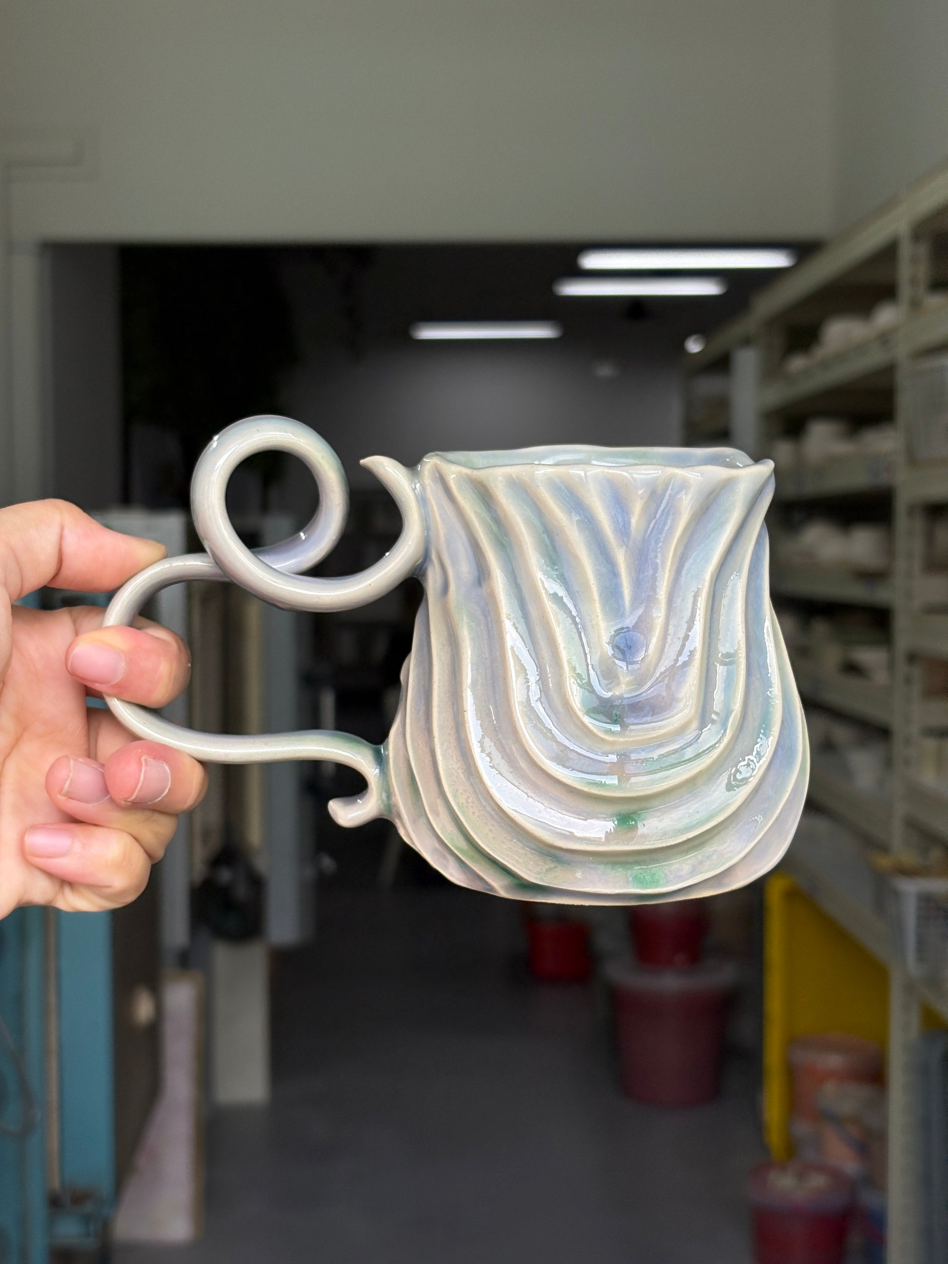 A glaze test that turned into one of my new favourite ever glaze colour to adorn a seabed mug. It's a little hard to capture the true colours, but some translucent lilac, hues of greens and all that.