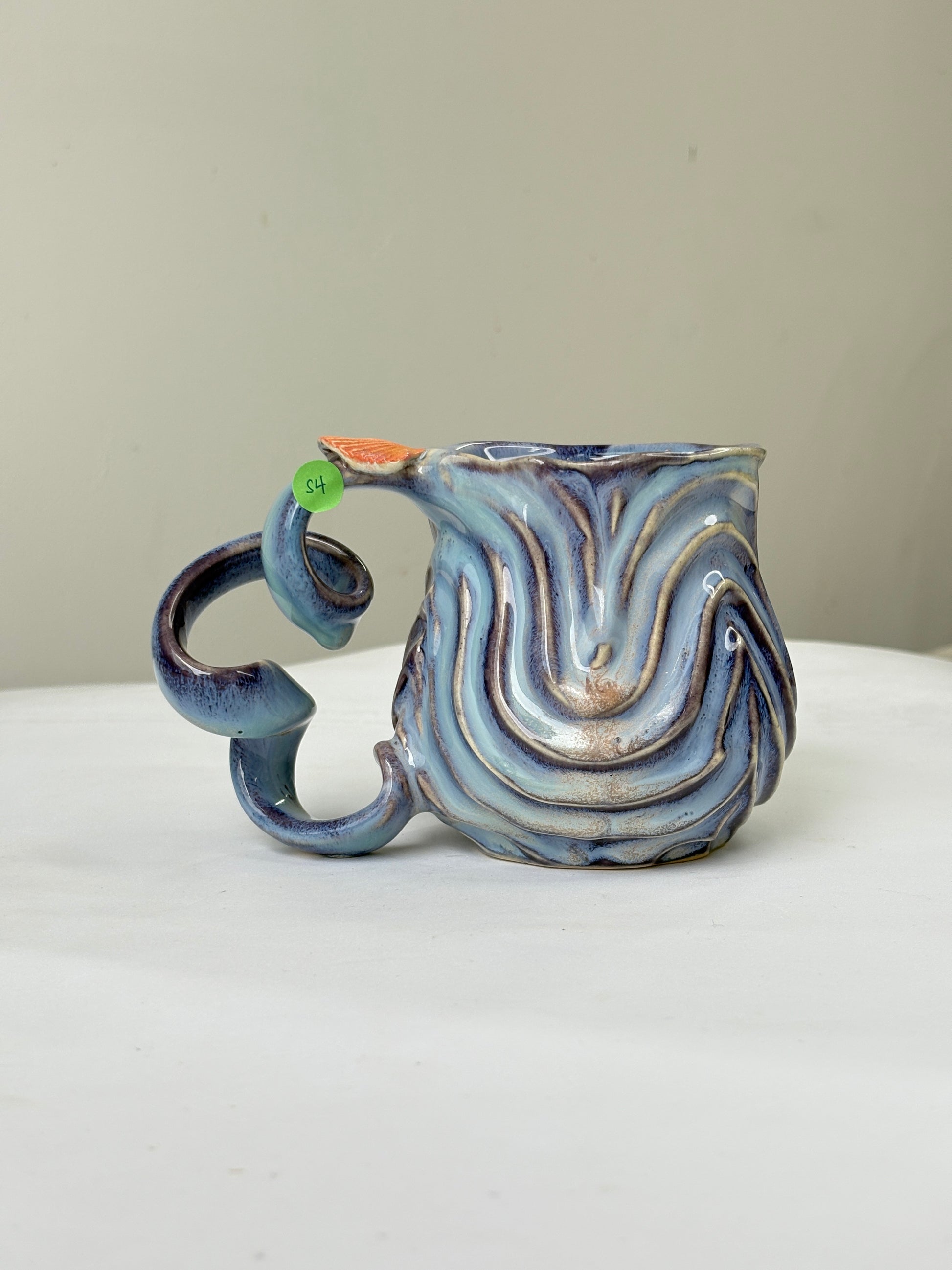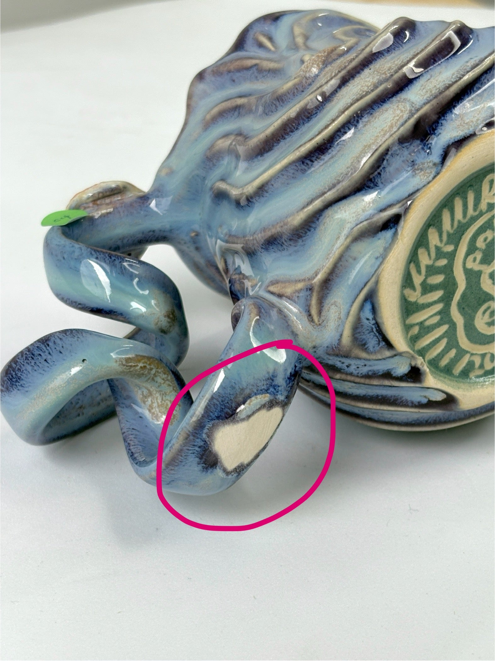 Defect: The handle sagged during firing, so it is really low, had to grind of a big glaze drip on the handle too. To be safe, use a coaster when using this mug so the handle can 'hang'